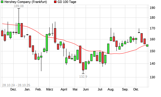 Mit dem Rücksetzer auf 154,60 EUR hat die Hershey Company-Aktie am 27.10.2025 die 100-Tage-Linie nach unten gekreuzt.Die Hershey Company-Aktie befindet sich seit dem 20.08.2025 im langfristigen ...weiterlesen