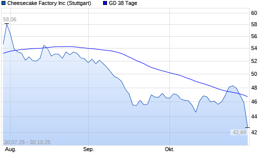 Mit dem Rücksetzer auf 43,23 EUR hat die The Cheesecake Factory-Aktie am 29.10.2025 die 38-Tage-Linie nach unten gekreuzt.Die The Cheesecake Factory-Aktie befindet sich seit dem 27.10.2025 ...weiterlesen