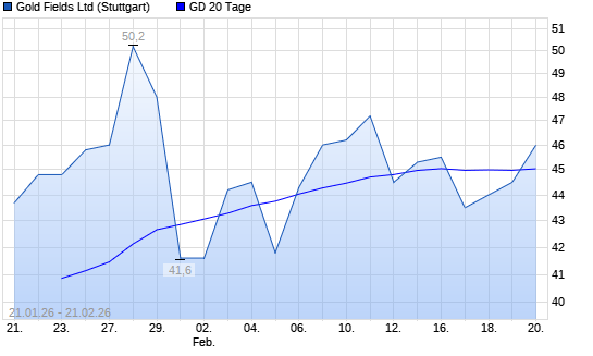 Mit dem Anstieg auf 45,60 EUR hat die Gold Fields-Aktie am 20.02.2026 die 20-Tage-Linie nach oben gekreuzt.Die Gold Fields-Aktie befindet sich seit dem 09.01.2025 im ...weiterlesen