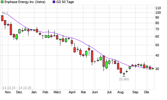Mit dem Rücksetzer auf 30,18 EUR hat die Enphase Energy-Aktie am 13.10.2025 die 50-Tage-Linie nach unten gekreuzt.Die Enphase Energy-Aktie befindet sich seit dem 19.09.2024 im langfristigen ...weiterlesen