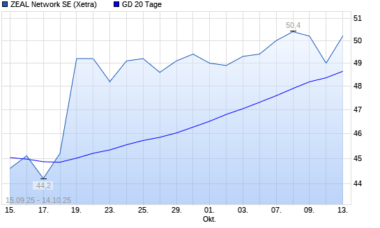 Mit dem Rücksetzer auf 48,60 EUR hat die ZEAL Network-Aktie am 13.10.2025 die 20-Tage-Linie nach unten gekreuzt.Die ZEAL Network-Aktie befindet sich seit dem 19.09.2025 im langfristigen ...weiterlesen