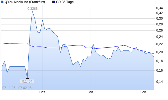 Mit dem Rücksetzer auf 0,19 EUR hat die QYOU MEDIA-Aktie am 06.02.2026 die 38-Tage-Linie nach unten gekreuzt.Der Abstand zur 200-Tage-Linie beträgt aktuell +6,98%. jetzt ...weiterlesen