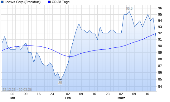 Mit dem Rücksetzer auf 91,50 EUR hat die Loews-Aktie am 19.03.2026 die 38-Tage-Linie nach unten gekreuzt.Die Loews-Aktie befindet sich seit dem 05.08.2025 im ...weiterlesen