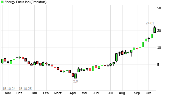 Mit dem Anstieg auf 22,44 EUR hat die Energy Fuels-Aktie (ISIN CA2926717083) am 14.10.2025 ein neues 10-Jahres-Hoch erreicht und damit den Kurs vom 13.10.2025 eingestellt.Die Energy Fuels-Aktie ...weiterlesen