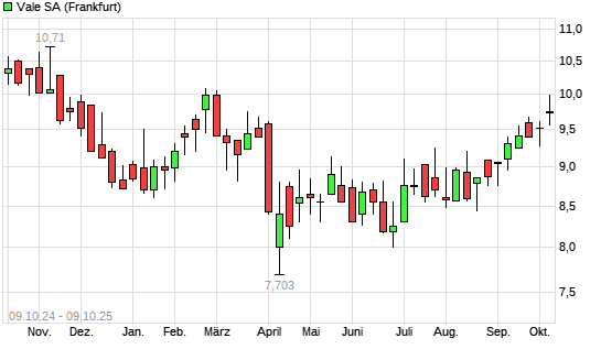Mit dem Anstieg auf 9,75 EUR hat die Vale-Aktie (ISIN BRVALEACNOR0) am 08.10.2025 ein neues 6-Monats-Hoch erreicht und damit den Kurs vom 07.10.2025 eingestellt.Die Vale-Aktie befindet sich ...weiterlesen