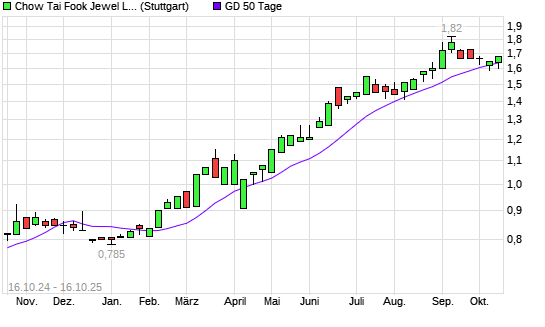 Mit dem Anstieg auf 1,65 EUR hat die CHOW TAI FOOK JEWEL.-Aktie am 15.10.2025 die 50-Tage-Linie nach oben gekreuzt.Die CHOW TAI FOOK JEWEL.-Aktie befindet sich seit dem 07.02.2025 im langfristigen ...weiterlesen