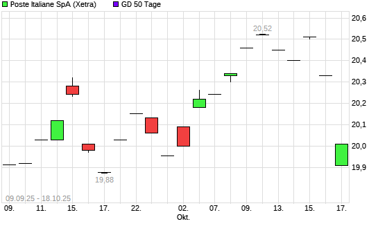 Mit dem Rücksetzer auf 19,99 EUR hat die Poste Italiane-Aktie am 17.10.2025 die 50-Tage-Linie nach unten gekreuzt.Die Poste Italiane-Aktie befindet sich seit dem 14.02.2024 im langfristigen ...weiterlesen
