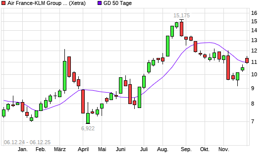 Mit dem Anstieg auf 10,95 EUR hat die Air France-KLM-Aktie am 05.12.2025 die 50-Tage-Linie nach oben gekreuzt.Die Air France-KLM-Aktie befindet sich seit dem 25.11.2025 im langfristigen Aufwärtstrend ...weiterlesen