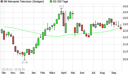 Mit dem Rücksetzer auf 12,66 EUR hat die M6 Metropole Television-Aktie am 24.09.2025 die 200-Tage-Linie nach unten gekreuzt.Die M6 Metropole Television-Aktie befand sich seit dem 24.06.2025 ...weiterlesen