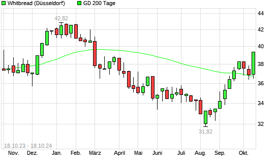 Mit dem Anstieg auf 38,92 EUR hat die Whitbread-Aktie am 17.10.2024 die 200-Tage-Linie nach oben gekreuzt.Die Whitbread-Aktie befand sich seit dem 15.10.2024 im langfristigen Abwärtstrend und ...weiterlesen
