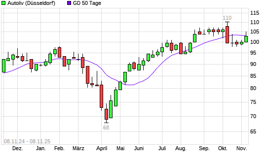 Mit dem Rücksetzer auf 103,00 EUR hat die Autoliv-Aktie am 07.11.2025 die 50-Tage-Linie nach unten gekreuzt.Die Autoliv-Aktie befindet sich seit dem 04.06.2025 im langfristigen Aufwärtstrend ...weiterlesen