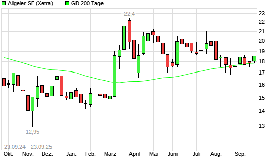 Mit dem Rücksetzer auf 17,85 EUR hat die Allgeier-Aktie am 22.09.2025 die 200-Tage-Linie nach unten gekreuzt.Die Allgeier-Aktie befand sich seit dem 18.09.2025 im langfristigen Aufwärtstrend ...weiterlesen