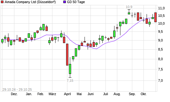 Mit dem Rücksetzer auf 10,40 EUR hat die Amada-Aktie am 28.10.2025 die 50-Tage-Linie nach unten gekreuzt.Die Amada-Aktie befindet sich seit dem 26.06.2025 im langfristigen Aufwärtstrend ...weiterlesen