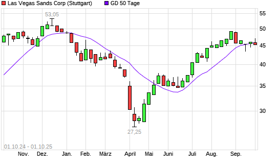Mit dem Rücksetzer auf 45,48 EUR hat die Las Vegas Sands-Aktie am 30.09.2025 die 50-Tage-Linie nach unten gekreuzt.Die Las Vegas Sands-Aktie befindet sich seit dem 24.07.2025 im langfristigen ...weiterlesen