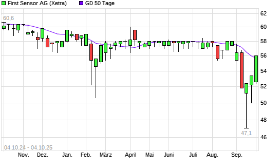 Mit dem Anstieg auf 55,80 EUR hat die First Sensor-Aktie am 03.10.2025 die 50-Tage-Linie nach oben gekreuzt.Die First Sensor-Aktie befindet sich seit dem 02.09.2025 im langfristigen Abwärtstrend ...weiterlesen