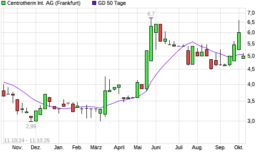 Mit dem Rücksetzer auf 5,00 EUR hat die CENTROTHERM PHOTOV.KONV.-Aktie am 10.10.2025 die 50-Tage-Linie nach unten gekreuzt.Die CENTROTHERM PHOTOV.KONV.-Aktie befindet sich seit dem 30.04.2025 ...weiterlesen