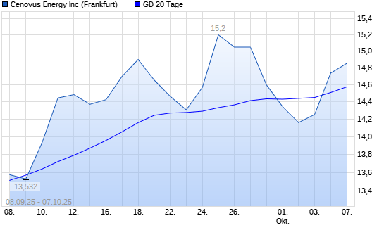 Mit dem Anstieg auf 14,74 EUR hat die Cenovus Energy-Aktie am 06.10.2025 die 20-Tage-Linie nach oben gekreuzt.Die Cenovus Energy-Aktie befindet sich seit dem 22.08.2025 im langfristigen Aufwärtstrend ...weiterlesen