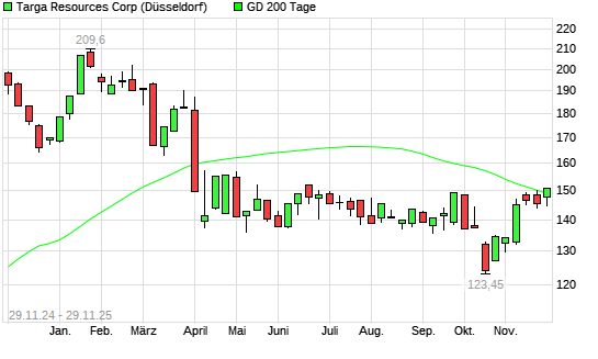 Mit dem Anstieg auf 150,85 EUR hat die Targa Resources-Aktie am 28.11.2025 die 200-Tage-Linie nach oben gekreuzt.Die Targa Resources-Aktie befand sich seit dem 27.11.2025 im langfristigen Abwärtstrend ...weiterlesen