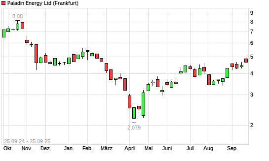 Mit dem Anstieg auf 4,97 EUR hat die Paladin Energy-Aktie (ISIN AU000000PDN8) am 24.09.2025 ein neues 6-Monats-Hoch erreicht und damit den Kurs vom 23.09.2025 eingestellt.Die Paladin Energy-Aktie ...weiterlesen