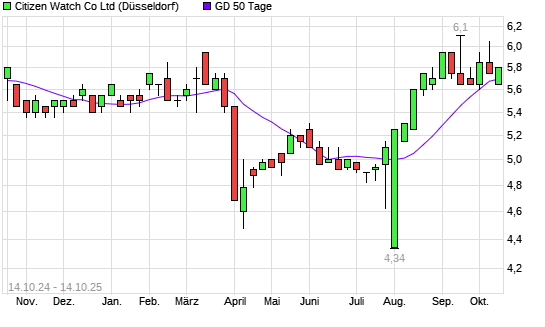 Mit dem Rücksetzer auf 5,70 EUR hat die Citizen-Aktie am 13.10.2025 die 50-Tage-Linie nach unten gekreuzt.Die Citizen-Aktie befindet sich seit dem 08.08.2025 im langfristigen Aufwärtstrend ...weiterlesen