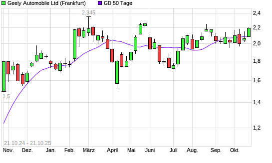 Mit dem Anstieg auf 2,12 EUR hat die Geely Automobile-Aktie am 20.10.2025 die 50-Tage-Linie nach oben gekreuzt.Die Geely Automobile-Aktie befindet sich seit dem 10.07.2025 im langfristigen Aufwärtstrend ...weiterlesen