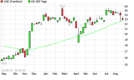 Mit dem Rücksetzer auf 22,80 EUR hat die CAE-Aktie am 21.08.2025 die 200-Tage-Linie nach unten gekreuzt.Die CAE-Aktie befand sich seit dem 14.08.2025 im langfristigen Abwärtstrend und hat ...weiterlesen