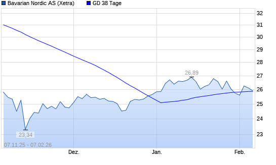 Mit dem Rücksetzer auf 25,67 EUR hat die Bavarian Nordic-Aktie am 06.02.2026 die 38-Tage-Linie nach unten gekreuzt.Die Bavarian Nordic-Aktie befindet sich seit dem 19.01.2026 ...weiterlesen