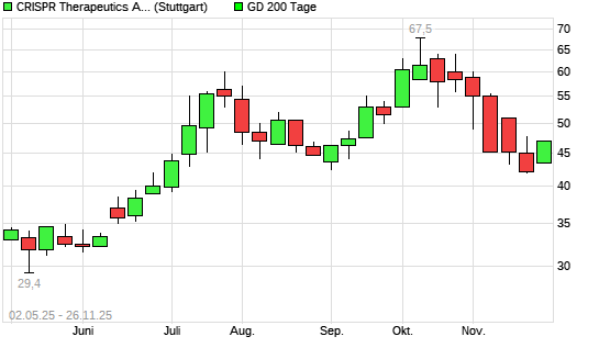 Mit dem Anstieg auf 44,80 EUR hat die CRISPR Therapeutics-Aktie am 25.11.2025 die 200-Tage-Linie nach oben gekreuzt.Die CRISPR Therapeutics-Aktie befand sich seit dem 20.11.2025 im langfristigen ...weiterlesen