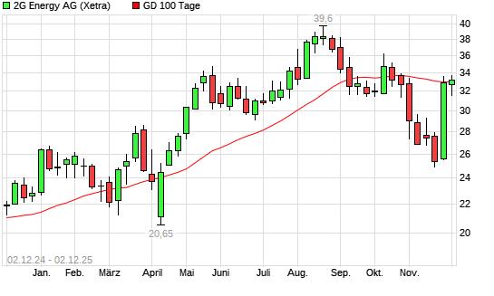 Mit dem Rücksetzer auf 31,70 EUR hat die 2G Energy-Aktie am 01.12.2025 die 100-Tage-Linie nach unten gekreuzt.Die 2G Energy-Aktie befindet sich seit dem 27.11.2025 im langfristigen Aufwärtstrend ...weiterlesen