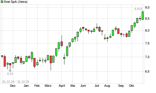 Mit dem Anstieg auf 8,78 EUR hat die Enel-Aktie (ISIN IT0003128367) am 30.10.2025 ein neues 3-Jahres-Hoch erreicht und damit den Kurs vom 29.10.2025 eingestellt.Die Enel-Aktie befindet sich ...weiterlesen