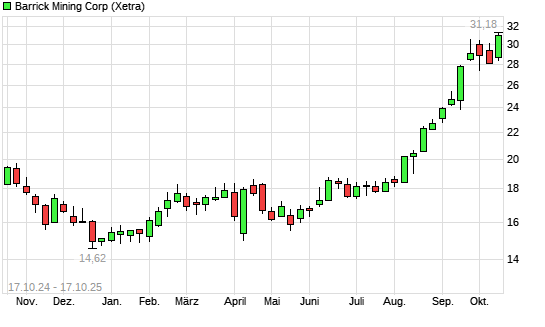 Mit dem Anstieg auf 30,42 EUR hat die Barrick Gold-Aktie (ISIN CA06849F1080) am 16.10.2025 ein neues 10-Jahres-Hoch erreicht und damit den Kurs vom 22.09.2025 eingestellt.Die Barrick Gold-Aktie ...weiterlesen