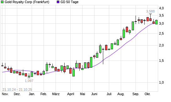 Mit dem Anstieg auf 3,20 EUR hat die Gold Royalty Corp-Aktie am 20.10.2025 die 50-Tage-Linie nach oben gekreuzt.Die Gold Royalty Corp-Aktie befindet sich seit dem 10.04.2025 im langfristigen ...weiterlesen