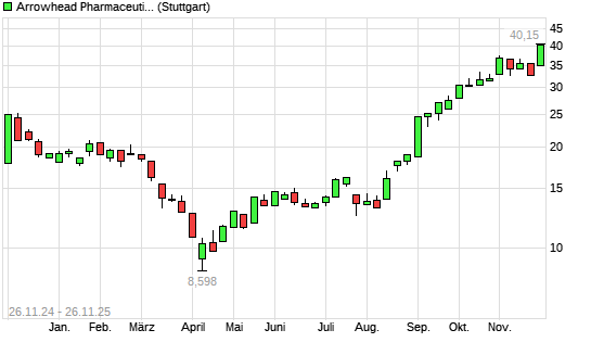 Mit dem Anstieg auf 40,35 EUR hat die Arrowhead Pharmaceuticals-Aktie (ISIN US04280A1007) am 25.11.2025 ein neues 3-Jahres-Hoch erreicht und damit den Kurs vom 24.11.2025 eingestellt.Die Arrowhead ...weiterlesen