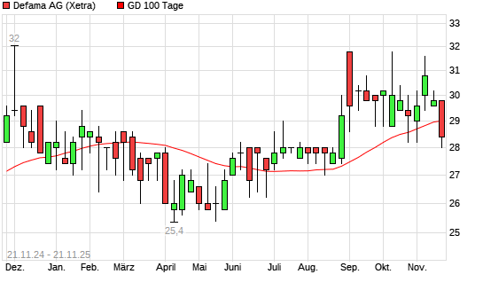 Mit dem Anstieg auf 29,00 EUR hat die DEFAMA-Aktie am 20.11.2025 die 100-Tage-Linie nach oben gekreuzt.Die DEFAMA-Aktie befindet sich seit dem 15.08.2025 im langfristigen Aufwärtstrend und hat ...weiterlesen