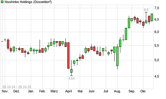 Mit dem Anstieg auf 6,85 EUR hat die Nisshinbo Holdings-Aktie (ISIN JP3678000005) am 24.10.2025 ein neues 12-Monats-Hoch erreicht und damit den Kurs vom 08.09.2025 eingestellt.Die Nisshinbo ...weiterlesen
