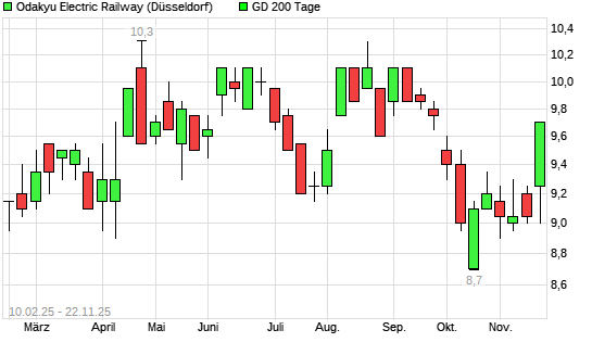 Mit dem Anstieg auf 9,70 EUR hat die Odakyu Electric Railway-Aktie am 21.11.2025 die 200-Tage-Linie nach oben gekreuzt.Die Odakyu Electric Railway-Aktie befand sich seit dem 02.10.2025 im langfristigen ...weiterlesen
