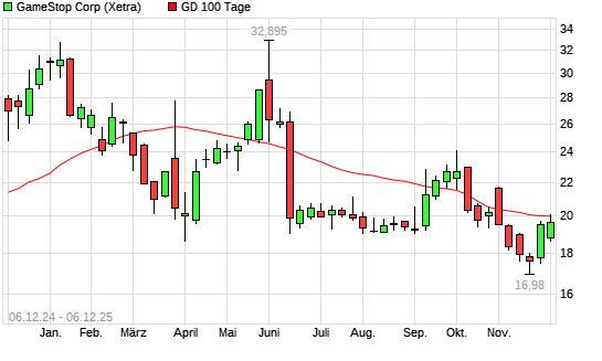 Mit dem Rücksetzer auf 19,51 EUR hat die GameStop-Aktie am 05.12.2025 die 100-Tage-Linie nach unten gekreuzt.Die GameStop-Aktie befindet sich seit dem 03.10.2025 im langfristigen Abwärtstrend ...weiterlesen