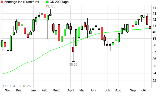 Mit dem Rücksetzer auf 40,24 EUR hat die Enbridge-Aktie am 16.10.2025 die 200-Tage-Linie nach unten gekreuzt.Die Enbridge-Aktie befand sich seit dem 20.08.2025 im langfristigen Abwärtstrend ...weiterlesen