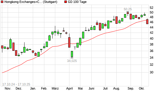 Mit dem Rücksetzer auf 46,43 EUR hat die Hongkong Exchanges+Clearing-Aktie am 16.10.2025 die 100-Tage-Linie nach unten gekreuzt.Die Hongkong Exchanges+Clearing-Aktie befindet sich seit ...weiterlesen