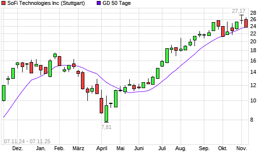 Mit dem Rücksetzer auf 23,62 EUR hat die SoFi Technologies-Aktie am 06.11.2025 die 50-Tage-Linie nach unten gekreuzt.Die SoFi Technologies-Aktie befindet sich seit dem 03.06.2025 im langfristigen ...weiterlesen
