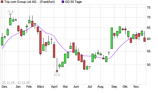 Mit dem Rücksetzer auf 60,50 EUR hat die Trip.com-Aktie am 20.11.2025 die 50-Tage-Linie nach unten gekreuzt.Die Trip.com-Aktie befindet sich seit dem 28.08.2025 im langfristigen Aufwärtstrend ...weiterlesen