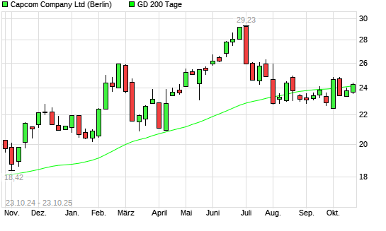 Mit dem Rücksetzer auf 24,12 EUR hat die Capcom-Aktie am 22.10.2025 die 200-Tage-Linie nach unten gekreuzt.Die Capcom-Aktie befand sich seit dem 21.10.2025 im langfristigen Aufwärtstrend ...weiterlesen