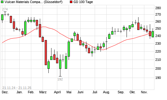 Mit dem Anstieg auf 248,00 EUR hat die Vulcan Materials Company-Aktie am 20.11.2025 die 100-Tage-Linie nach oben gekreuzt.Die Vulcan Materials Company-Aktie befindet sich seit dem 04.08.2025 ...weiterlesen