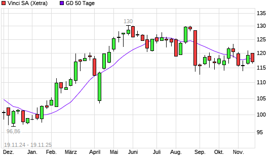 Mit dem Rücksetzer auf 116,20 EUR hat die Vinci-Aktie am 18.11.2025 die 50-Tage-Linie nach unten gekreuzt.Die Vinci-Aktie befindet sich seit dem 14.11.2025 im langfristigen Abwärtstrend ...weiterlesen