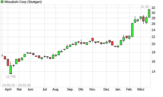Mit dem Anstieg auf 31,50 EUR hat die Mitsubishi-Aktie (ISIN JP3898400001) am 18.03.2026 ein neues All-Time-High erreicht und damit den Kurs vom 17.03.2026 eingestellt.Die ...weiterlesen