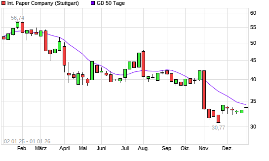 Mit dem Anstieg auf 33,66 EUR hat die International Paper-Aktie am 31.12.2025 die 50-Tage-Linie nach oben gekreuzt.Die International Paper-Aktie befindet sich seit dem 30.07.2025 im langfristigen ...weiterlesen