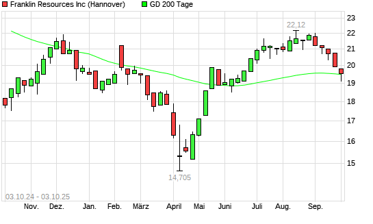 Mit dem Rücksetzer auf 19,11 EUR hat die Franklin Resources-Aktie am 02.10.2025 die 200-Tage-Linie nach unten gekreuzt.Die Franklin Resources-Aktie befand sich seit dem 06.06.2025 im langfristigen ...weiterlesen