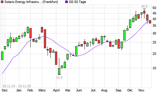 Mit dem Rücksetzer auf 38,20 EUR hat die Solaris Energy Infrastructure-Aktie am 18.11.2025 die 50-Tage-Linie nach unten gekreuzt.Der Abstand zur 200-Tage-Linie beträgt aktuell +41,79%. ...weiterlesen