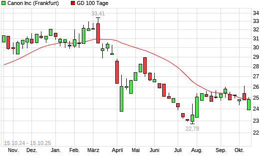 Mit dem Rücksetzer auf 24,34 EUR hat die Canon-Aktie am 14.10.2025 die 100-Tage-Linie nach unten gekreuzt.Die Canon-Aktie befindet sich seit dem 26.03.2025 im langfristigen Abwärtstrend ...weiterlesen