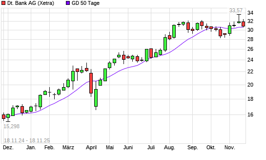 Mit dem Rücksetzer auf 30,34 EUR hat die Deutsche Bank-Aktie am 17.11.2025 die 50-Tage-Linie nach unten gekreuzt.Die Deutsche Bank-Aktie befindet sich seit dem 15.08.2024 im langfristigen ...weiterlesen